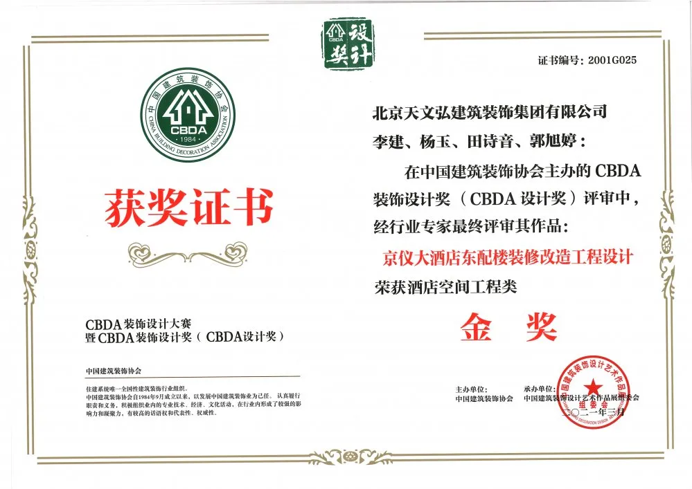 恭喜我司设计团队在中国建筑装饰协会主办的 CBDA装饰设计奖评审中,经行业专家最终评审其作品“京仪大酒店东配楼装修改造工程设计”荣获酒店空间工程类金奖。